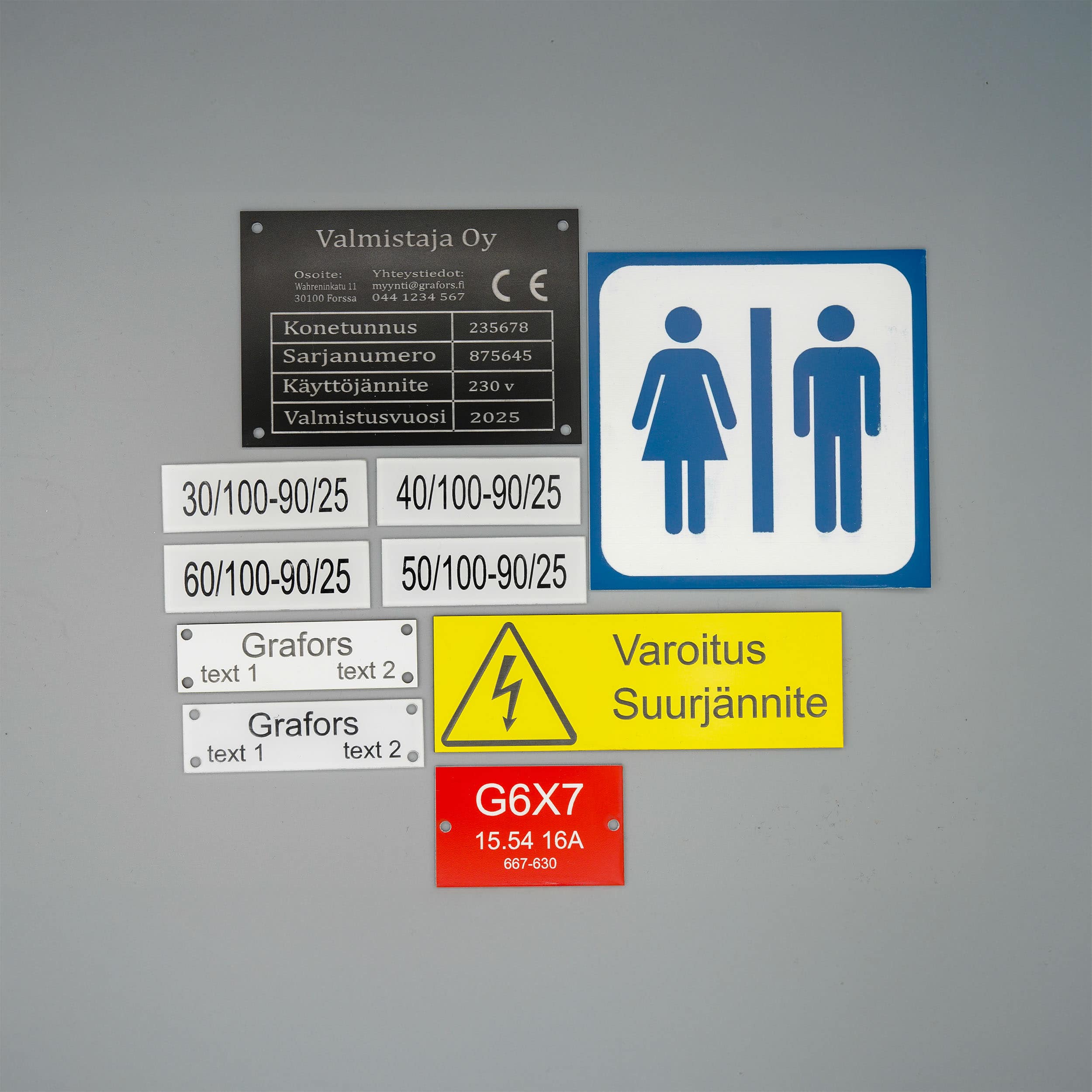 Grafors Oy suunnittelee ja valmistaa merkintäkilpiä, opasteita ja kaiverruksia, jotka täyttävät nykyaikaisen teollisuuden vaatimukset ja standardit. CO₂-laserteknologia mahdollistaa tarkan, toistettavan ja tehokkaan tuotannon niin pieniin kuin suuriin sarjoihin. Pystymme merkitsemään kilpiin myös QR- sekä viivakoodit. Tarjoamme ratkaisuja teollisuuteen sekä julkiselle sektorille. Käyttökohteita ovat tehtaat, sairaalat, kiinteistöt, kunnallistekniikka, koulut, yritykset, yms.